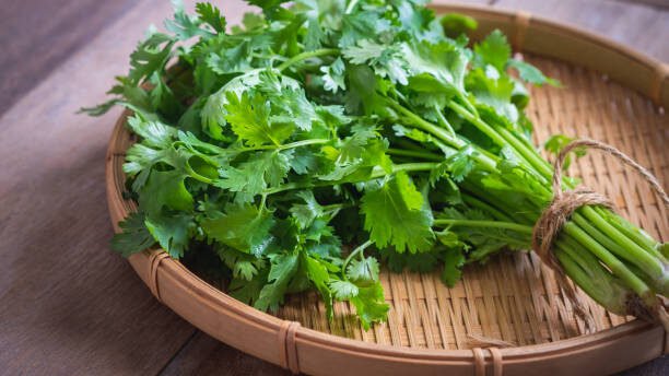 Fresh coriander, cilantro leaves on basket