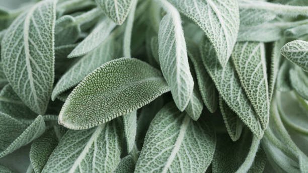 Salvia officinalis. Clary Sage natural green leaves macro background plant photography.